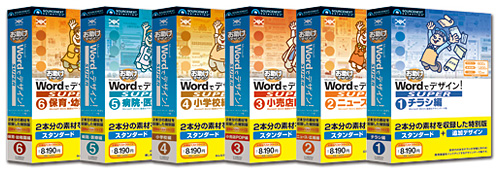 ラインアップは、「Wordでデザイン!SUPER 01 チラシ編」「Wordでデザイン!SUPER 02 ニュース・広報編」「Wordでデザイン!SUPER 03 小売店POP編」「Wordでデザイン!SUPER 04 小学校編」「Wordでデザイン!SUPER 05 病院・医療編」「Wordでデザイン!SUPER 06 保育・幼稚園編」。