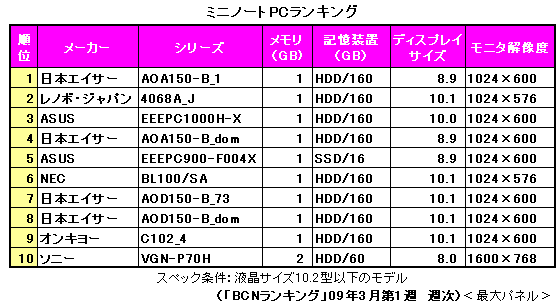 3月第1週(09年3月2日-3月8日)のミニノートPC1位は、日本エイサーの「Aspire one」シリーズの「AOA150-B_1」だった。解像度1024×600ドットの8.9型液晶を搭載。本体カラーはサファイアブルー、シーシェルホワイト、ギャラクシーブラック、コーラルピンクとゴールデンブラウンの5色。「AOA150-B_1」はオフィスソフトは非搭載だが、4位に「Office Personal 2007」搭載モデル「AOA150-Bdom」もランクインしている。