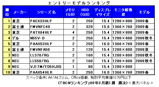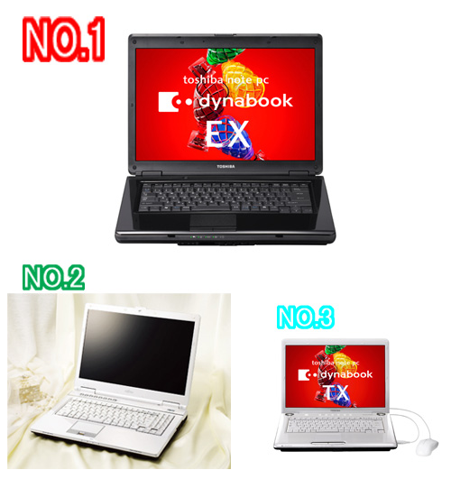 2位は富士通の「FMVNFC40」。15.6型ワイド液晶、2GBメモリ、320GBのHDD、2層書き込み対応のDVDスーパーマルチドライブを搭載する。また3位は、東芝の「PATX64HLP」で、15.4型ワイド液晶、4GBメモリ、250GBのHDD、2層書き込み対応のDVDスーパーマルチドライブを備える。