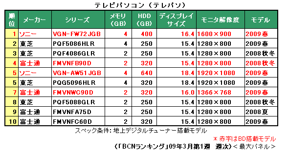 3月第1週のテレパソの1位は、BDドライブを搭載したソニーの「VGN-FW72JGB」だった。16.4型ワイド液晶、4GBメモリ、320GBのHDDを搭載する。地上デジタルチューナーを2基搭載しているため、地デジの2番組同時録画も可能だ。