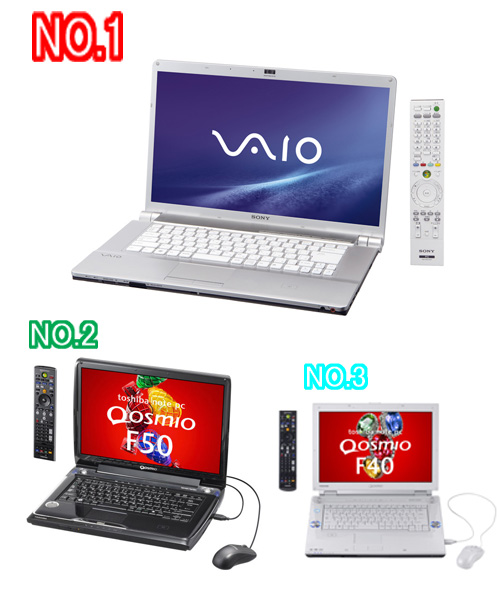 2、3位は東芝の「Qosmio」シリーズで、2009年春モデルの「PQF5086HLR」、2008年秋冬モデルの「PQF4086GLR」が続いた。どちらも15.4型ワイド液晶、250GBのHDD、2層書き込み対応のDVDスーパーマルチドライブ、地上デジタルチューナー1基を搭載。さらに、新製品の「PQF5086HLR」は、4GBのメモリを内蔵する。