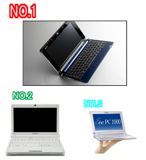 3位はASUSの「EeePC」シリーズから10型ワイド液晶を搭載した「EEEPC1000H-X」が入った。メモリは1GB、HDDは160GBで、本体カラーはファインエボニー、パールホワイトの2色。ちなみに、1位から3位まで、いずれもCD/DVDドライブを装備していない。市販のパッケージソフトをインストールする場合は、外付けCD/DVDドライブを別途用意するか、最近増えつつあるUSBメモリに収録されたソフトなどを利用しよう。