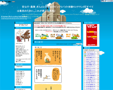 Japan Blog Award実行委員会は3月26日、ブログの活性化を目的に一般のブログを表彰するイベント「Japan Blog Award 2009」の表彰式を都内で開催した。総エントリー数2866ブログのなかから、ブログネーム「きんとと」さんの「きんととの官公庁ビックリバイト体験4コママンガ『すべては県民のために。これが県庁公務員』」が総合グランプリに選ばれた。