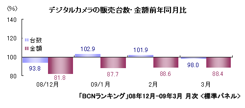 好調なこれらの製品とは対象的に、デジタルカメラは台数・金額とも厳しい状況が続いている。平均単価は下げ止まったが、金額は年末から前年を下回り、台数も1-2月こそ前年並みを確保したが、3月は前年割れとなった。