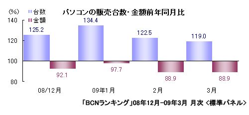 パソコンは構成比で8割を占めるノートPCが好調で、08年の年末商戦から台数は前年同月比2ケタ増を維持しているが、09年1月は22.5%、3月は19%と、伸び率は鈍化している。金額は前年割れが続いており、マイナス幅が拡大している。昨年から市場を牽引した低価格のミニノートPCが人気を集めたことで、単価下落がパソコン全体に波及したことが要因とみられる。
