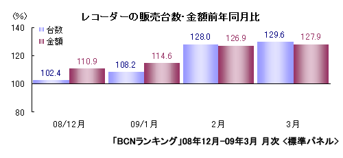 レコーダーも、薄型テレビと歩調を合わせ12月から台数・金額とも、伸び率はプラスに転じた。特に、前年同月比30%近くまで拡大した金額の伸び率が目立つ。レコーダー全体に占める構成比で09年3月に台数で6割、金額では8割目前に迫ったブルーレイディスク(BD)レコーダーの普及や、薄型テレビとのセット販売などが後押ししたようだ。
