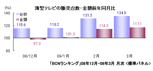 不況でもデジタル家電の販売は好調――BCN(奥田喜久男社長)は、全国の大手家電量販店から実売データを集計した「BCNランキング」をもとに、薄型テレビ、レコーダー、パソコンの08年12月-09年3月の販売台数・金額は前年同月比で2ケタ増を記録したと発表した。消費不況が叫ばれるなか、デジタル家電は価格下落も追い風になり、需要を取り込んでいる。