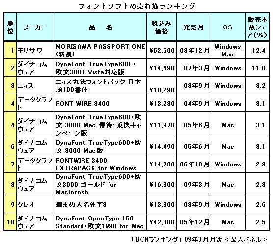 今回は家電量販店で手に入る「フォントソフト」の売れ筋ランキングをチェックしてみた。09年3月のフォントソフトランキングでは、1位はモリサワの「MORISAWA PASSPORT ONE」。2位はダイナコムウェアの「DynaFont TrueType600 + 欧文3000 Vista対応版」、3位は初心者向けフォントソフト「ニィス丸徳フォントパック 日本語100書体」だった。