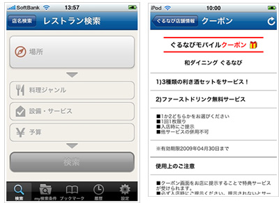 「場所」「料理ジャンル」「設備・サービス」「予算」の4つの検索軸を用意し、iPhone 3Gの場合はGPSを使ったエリア検索も利用できる。検索結果は、一覧で表示され、同時にクーポンの有無も確認可能。そのほか、ブックマーク機能や履歴機能を備える。