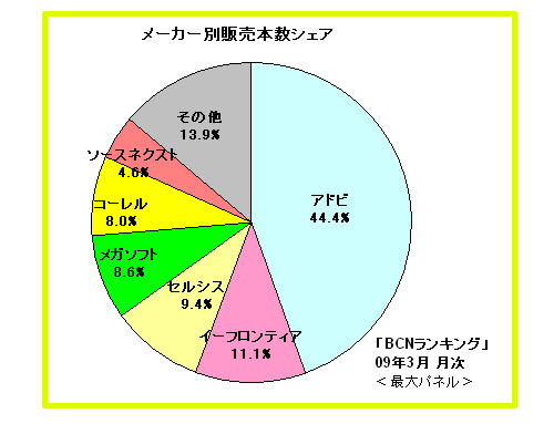グラフィックスソフト市場の全体を把握するため、まずは09年3月のメーカー別販売本数シェアを見ていこう。1位は「Illustrator」「Photoshop」など、上級者向けのソフトを販売しているアドビ システムズで、販売本数シェアは44.4%。2位はイーフロンティアで11.1%、そして3位セルシスが9.4%でつけている。