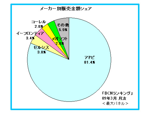 一方、メーカー別販売金額シェアでは、アドビが81.4%と圧倒的なシェアを獲得した。2位はセルシスで3.8%、3位はイーフロンティアで3.4%と、アドビに大きく引き離された。販売本数、金額ともアドビは高いシェアを獲得しており、アドビはグラフィックスソフト市場の代表メーカーともいえる。