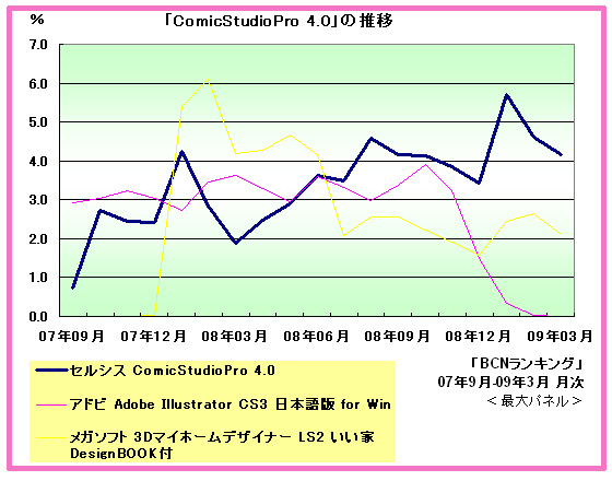 そんな中、ここ最近、セルシスのペイントソフト「ComicStudioPro 4.0」の人気が高まっている。発売は07年9月で、同人誌即売会「コミックマーケット」が開催、もしくは終了した月である1月と8月に販売本数シェアを大きく伸ばしながら推移している。また、08年6月から1-2位の間で推移しており、直近の09年1-3月は3か月連続で1位を獲得した。