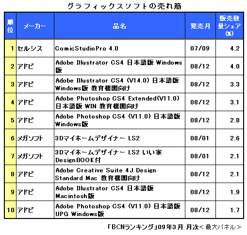 それでは最新のランキングをチェックしてみよう。09年3月のグラフィックスソフト1位を獲得したのはセルシスの「ComicStudioPro 4.0」で、販売本数シェアは4.2%。「ComicStudioPro 4.0」は、「ComicStudio 4.0」シリーズの上位モデル。ベタやトーンなど、塗る場所がきちんと線で囲まれていないと起こる塗り漏れを防止する機能や、紙の原稿用紙をスキャンする際に発生する黒い点(ゴミ)を取り除く機能など、作業効率を高める機能を搭載している。