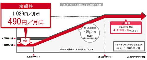 取り組み内容として発表したのは、パケット定額サービス「パケ・ホーダイ ダブル」と「Biz・ホーダイ ダブル」の見直し。両プランとも、従来の定額料金は月額1029円からだったが、5月1日以降は、月額490円からに改定する。料金の上限は従来通りで、「パケ・ホーダイダブル」が4410円(iモードフルブラウザ利用時は5985円)で、「Biz・ホーダイ ダブル」が5985円。