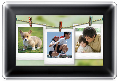薄さ23mmのスリムなデザインを採用。スライドショー機能は、1枚ずつの通常表示のほか、3枚の画像を同時に表示したり、複数の画像を一度に表示したりできる。また、写真と一緒に表示可能な、時計・カレンダー機能を備える。