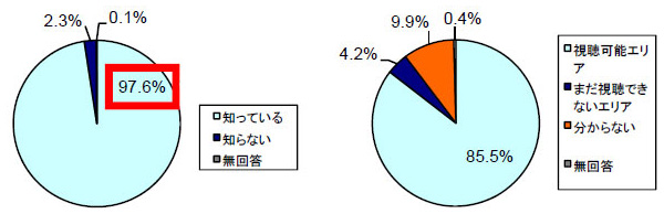 左=地上デジタルテレビ放送の認知度 右=居住地域での地上デジタルテレビ放送視聴可否の認知度