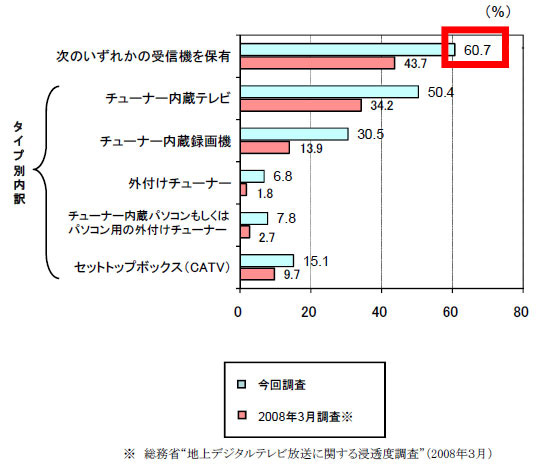総務省、地デジ浸透度調査、地デジ対応受信機の世帯普及率は60.7%