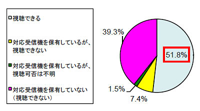 「地上デジタルテレビ放送の視聴可否」については、「視聴できる」が51.8%と半分を超えた。また、「地上デジタルテレビ放送の満足度」は「満足」が53.2%、「やや満足」が24.9%と、8割近い人が満足しており、その理由として多くが「画質の良さ」を挙げている。