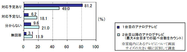 一方、対応受信機を1台も保有していない世帯では、「アナログ放送停波までの対応予定」について、81.2%が1台目のアナログテレビで「対応予定あり」と回答。「対応時期等の目安」は、同じく1台目のアナログテレビで59%が「アナログ放送終了までには対応する」と答えた。