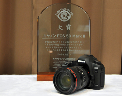 カメラ記者クラブは5月15日、年間を通じて日本国内で発売されたスチルカメラの中から優れた製品を表彰する「カメラグランプリ2009」の各賞を発表し、最も優れた製品に贈られる「大賞」は、キヤノンのデジタル一眼レフカメラ「EOS 5D Mark II」が受賞した。