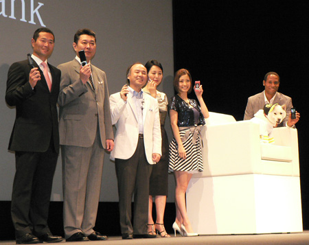 左から、桑田真澄さん、江川卓さん、孫 正義社長、樋口可南子さん、上戸彩さん、犬のお父さん、ダンテ・カーヴァーさん
