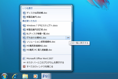 複数のウィンドウを開いている場合は、開いているウィンドウやアプリケーションをサムネイルで確認できるほか、タスクバーから一覧を表示し、「閉じる」ボタンで終了させることも可能になった。また、よく使うファイルやフォルダを最大10項目まで自動で選別し、すぐにアクセスできるようにした「ジャンプリスト」機能も追加された。