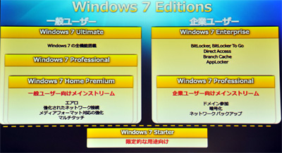 また、Windows 7の一般向けエディションについては、機能限定版のWindows 7 Starter、主力商品となる同Home Premium、同Professionalに加え、Windows 7の機能をすべて搭載した同Ultimateの4種類が用意される予定。adpds_js('http://ds.advg.jp/adpds_deliver', 'adpds_site=bcnranking&adpds_frame=waku_111395');