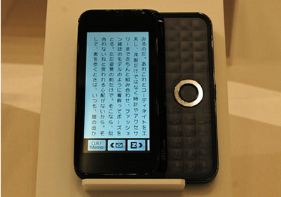 東芝製の「biblio(ビブリオ)」は、小説約5000冊を持ち運んで閲覧することができる端末。大容量約7GBのデータフォルダと電子書籍ビューアー「Book Player」を搭載し、コンテンツは電子書籍サービス「EZブック」からダウンロードする。デザインは、本を読むスタイルを想起させる横スライド方式を採用した。画面を触ることで操作可能なタッチスタイルとキー操作の2つの操作に対応。また、画面を横向きにすると10キーがQWERTYキー表示に切り替わり、PCのような感覚で利用できる。