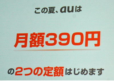 KDDIは5月25日、月額390円から始まるパケット通信料定額サービス「ダブル定額スーパーライト」を8月1日に、月額390円でユーザーが指定したau携帯電話への国内通話料が24時間無料になる通話料割引サービス「指定通話定額」を8月10日に提供すると発表した。
