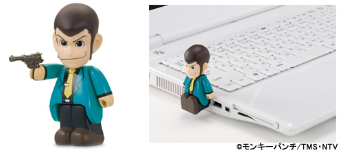 今回のモデルは、1971年に放映されたアニメで、「ルパン三世 1stシリーズ」とよばれる、主人公のルパンが緑のジャケットを着ているバージョンをもとにしている。作中、ルパンが愛用していた銃が別パーツで付属し、手に装着することができる。容量は2GB。対応OSはWindows Vista/XP/2000/Me、Mac OS X 9.0-9.2.2/10.1以降。