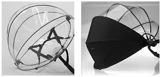 「ヌーブレラ」は、頭部全体をカバーするドーム型のデザインを採用した、次世代の傘。向かい風は傘の周りを通り過ぎるので、折れる心配がない。背負うように装着し、ハンズフリーで使用できる。肩と脇を固定できるので、安定性に優れ、ドーム型のデザインから、高い防寒性もある。