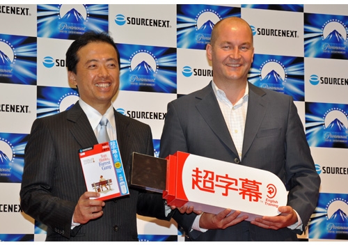 「超字幕」の発売発表を行うソースネクストの松田憲幸社長(左)と、パラマウントのAlex Carloss Executive Vice President and General Manager Worldwide Digital Distribution