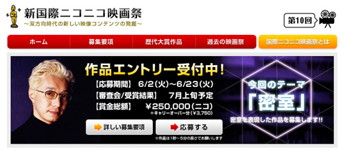 「ニコニコ映画祭」は、ユーザーから募集したユニークな動画作品を表彰する企画で、今回のテーマは「密室」。同社は「国際ニコニコ映画祭」を、「ニコニコユーザーの皆様から動画を募集し、審査員会の厳選なる選考にてオモシロイ作品を選んでいく極めてハートフルなお祭り」としている。賞金総額は25万円で、各賞ごとに分配される。