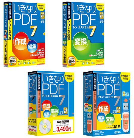 ラインアップと価格は、PDFファイルの作成・ページ編集・注釈の付加などができる、PDF作成・編集ソフト「いきなりPDF 7」と、PDFファイルをWord/Excel/PowerPointなどの形式にデータ変換できる、PDFデータ変換ソフト「いきなりPDF to Data 7」が2990円、これらをセットにした「いきなりPDF Platinum 7」が3490円、同USBメモリ版「いきなりPDF Platinum 7(Uメモ)」が3990円。