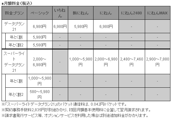 また、同社では今回の高速データ通信サービス開始にともない、新料金プランを発表。1年間の継続利用を条件に基本使用料を割引するサービスで、従来の「年とく割」よりもさらに安い「年とく割2」を導入する。月額基本使用料が580円からの「スーパーライトデータプラン21」、月額料金5580円の完全定額制「データプラン21」の2種類を用意する。