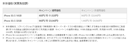 端末の購入時には、同社が展開しているiPhone 3G向けのキャンペーン「iPhone for everybody キャンペーン」が利用可能。ユーザーが、2年契約を含む新規契約・新スーパーボーナスで「iPhone 3G S」を購入した場合、端末購入にかかる実質的な負担額は、16GBモデルで月額480円の24回払い(総額1万1520円)、32GBモデルで月額960円の24回払い(総額2万3040円)となる。また、通常は月額5985円のパケット通信料定額サービスの上限料金が、月額4410円で利用できるようになる。