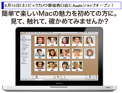 ビックカメラは6月10日、ビックカメラ新宿西口店4階のMacコーナー内に「Appleショップ」を設置し、6月13日にオープンすると発表した。