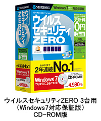 ソースネクストは6月12日、マイクロソフトの次期OS「Windows 7」で使える更新料0円のセキュリティソフト「ウイルスセキュリティZERO 3台用(Windows 7対応保証版)CD-ROM版」を7月3日に発売すると発表した。価格は4980円。