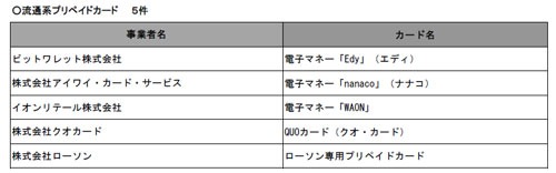 「流通系プリペイドカード」が、ビットワレットの「Edy(エディ)」、アイワイ・カード・サービスの「nanaco(ナナコ)」、イオンリテールの「WAON」などの電子マネーを含む5件。そのほか、「旅行・宿泊券」や「クレジット系商品券」、「地域型商品券」など合計271件が決定した。