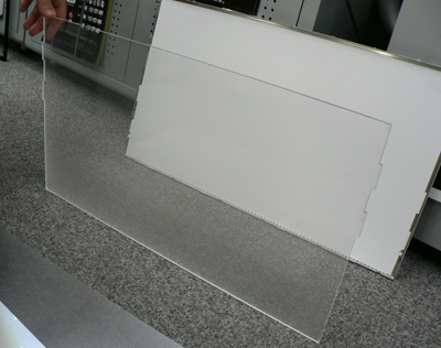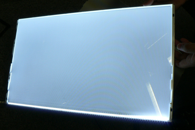 画面側からみて一番奥に当たる導光板には、横一列に並んだLED光源に近いほど小さく、遠くなるほど大きい穴が開いており、これにより、光を均一に広げる仕組みになっている。さらに、偏光板、集光板、拡散板を組み合わせることによって光が均一になり、輝度ムラを減らしているのだという。