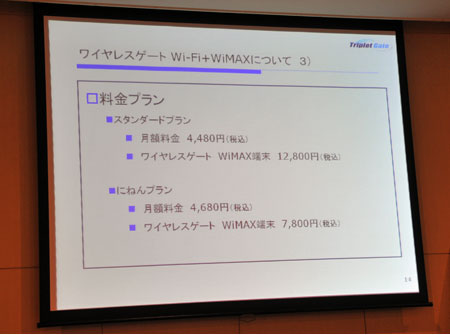 「WiMAX」のサービスは、同サービスを展開する通信事業者・UQコミュニケーションズがもつ通信インフラを借り、トリプレットゲートは仮想移動体通信事業者「MVNO」としてサービスを提供する。接続速度や利用可能エリアはUQコミュニケーションズのサービスと同等で、速度は下り最大40Mbps、上り最大10Mbps。サービス開始時点の利用可能なエリアは東京23区、横浜、川崎の首都圏、京阪神の一部、名古屋市の一部。なお、「WiMAX」サービス利用時は、専用モデム「Aterm WM3200U」をパソコンに接続することが必要。