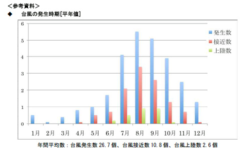 過去の統計によると、90年代後半以降は、台風発生数の少ない時期に当たるが、台風上陸数が10個と過去最多となった04年のように、1年に集中して現れることがあり、当時もエルニーニョ現象の影響があったと考えられることから、今年も台風の動向については油断できないとして、注意を呼びかけている。
