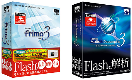 「Flash CS3」の作成・解析に対応したほか、Flashファイルを動画ファイルやGIFアニメーションとして保存する機能も搭載した。なお、パッケージ通常版の初回特典として、同日発売のSilverlightコンテンツ作成ソフト「frimo for Silverlight」が付属。Flash編集だけでなく、「Microsoft Silverlight」の編集も行える。