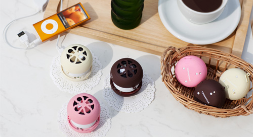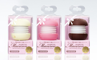 洋菓子のマカロンをモチーフにした、ストロベリー、チョコ、バニラの3色を用意するステレオスピーカー。製品パッケージも菓子箱をイメージさせるデザインを採用した。