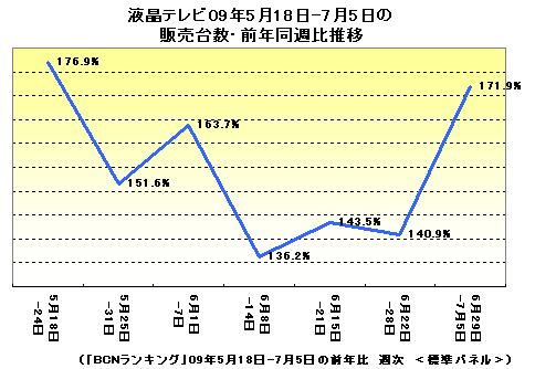 トップはスタート直後の5月18日-24日の週で76.9%増。6月に入って徐々に伸び率が下がってきていたが、6月19日に環境省がエコポイントの交換商品を発表。金券などとも交換できるという詳細が知られるようになるにつれ、薄型テレビの購入を決める消費者が増え、伸び率の回復につながったようだ。(BCN・武井美野里)