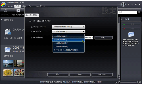 動画フォーマットは「MPEG2」と「WMV」が選択可能。DVDに焼くことが前提ならMPEG2、ネット経由での配布ならばWMVを選ぶといい。ファイルのサイズは320×240のワンセグサイズから1280×720のHD対応の薄型テレビサイズまで幅広く対応する。ここではメールによる配布や動画共有サイトへのアップロードを想定し、640×480のVGAサイズにした。所要時間は画像の解像度やBGMに使用する楽曲ファイルの容量などで変わってくるが、おおむね5-30分程度といったところ。