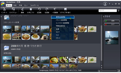 このほか、「これは使える」と思ったのが、先にも述べた「一括補正機能」。輝度やコントラスト、暗部修正、ホワイトバランスなどをワンクリックで補正してくれる機能で、指定した画像ファイルすべてを一括で調整してくれる。特に旅行の写真など、撮影した点数が100枚以上にも及ぶような場合に重宝する。
