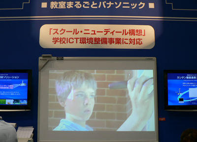 今回初出展したパナソニックコミュニケーションズは、5月に発売した電子黒板「エリートパナボード」の新モデルを展示。プロジェクターで学習コンテンツを投影し、専用の電子ペンで書き込みができるデモを行った。新製品は、本体にスピーカーを搭載していることが大きな特徴。英語の発音を学ぶ授業の際に、別途スピーカーを設置する必要がない利便性を訴求した。
