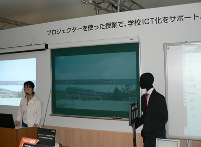 三洋電機は、プロジェクターを展示。「黒板」に投影できる機能をアピールした