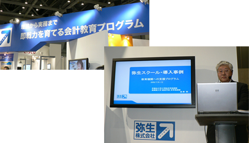 弥生は、学校向けパッケージ「弥生スクール」を展示。早稲田大学、亜細亜大学講師の遠藤誠・西日本ジャテックス東京オフィスコンサルティング事業部マネジャーが、学校の導入事例を紹介